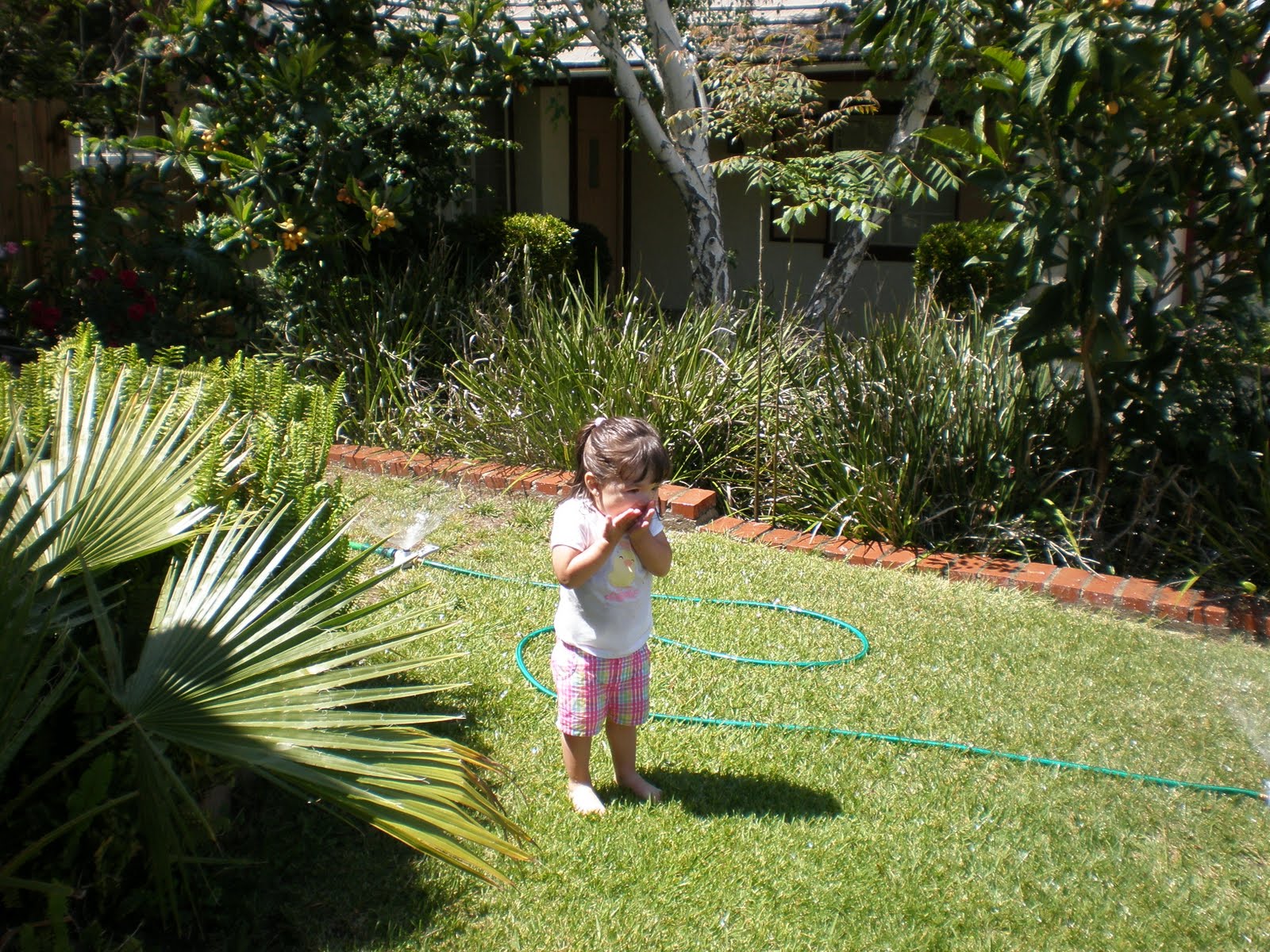 So last Tuesday my mom let Julia have some water fun in our sprinklers! She LOVES the water and had a blast running through the sprinklers:) Enjoy the pics